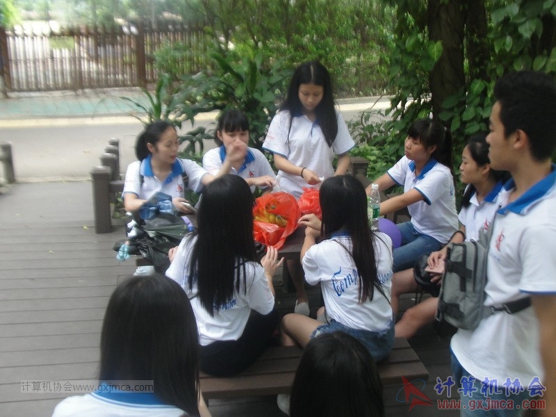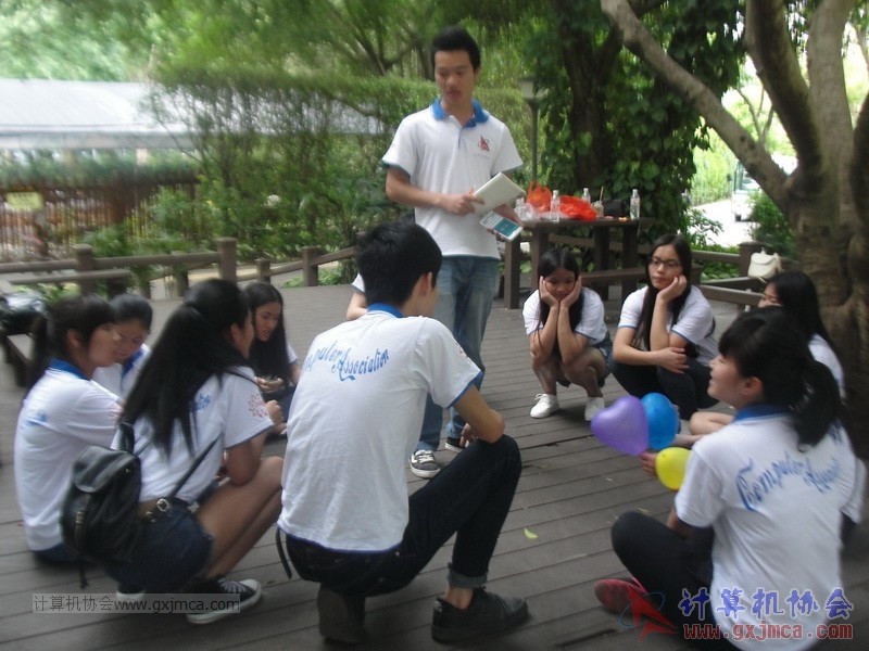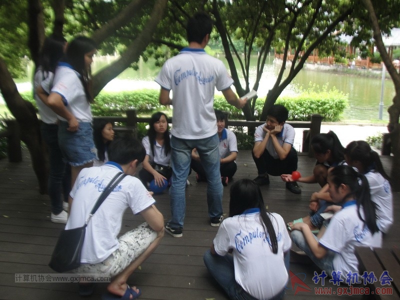 我们集中后一起乘坐公交车向金花茶公园进军了。由于公园门口没有站牌,我们只能在后一站下车,往回走了一段路之后才于下午1点左右到达我们此次的目的地。大家在门口合照完之后就向公园里面走去,我们一路前行,炎热的天气没有减轻我们丝毫的热情,开心的欣赏着公园的建筑和美景。我们四处闲逛,来到一个叫“邀月阁”的长廊,这里围绕着一湖池水,水里养了很多美丽的金鱼,大家看到都很喜欢。逛了一圈后,我们来到了一个阴凉的小亭子,最终决定在这里休息。我们一起坐着闲聊,吃零食,各种开心。歇了一会之后,我们就开始玩游戏啦!第一个游戏叫“谁是卧底”,这个可是以计元为赌注的游戏啊,大家都很想赢!一共八个人参赛,两个人是卧底,大家要根据自己抽到的纸条说出那个词的相关信息,然后找出卧底。游戏玩了几轮,其中多次都是廖桂鹏抽到卧底词条,大家都笑她的手气很“好”!到最后,大家输赢都差不多,而且玩上瘾了,都要求再来一轮!不过由于时间关系,我们只能到此为止,进行下一个游戏。第二个游戏叫“计时问题”,主持人在手机设定了一定时间的闹钟,大家就坐着围成一个圈传瓶子,拿瓶子的同学要答对主持人的问题才能把瓶子传给下一位。轮到谁拿着瓶子的时候闹钟刚好响了,谁就输了!输方要应大家的要求做出相应的惩罚。没想到第一轮游戏就是我们的会长大人李玉洁输了,我们大家对她设的惩罚就是去抱垃圾桶,哈哈哈!之后几轮也有小伙伴输的要唱歌,对树表白等各种花样惩罚!大家玩得不亦乐乎!游戏结束之后,大家又休息了一会,期间有的成员去了小卖部买吃的,里面的食品物价很贵,一个冰淇淋就要6块钱。到了下五5点左右,在时间上我们考虑到晚上还有聚餐活动,大家都提议回去了。但是人事部还要拍视频材料,也有的成员想要继续逛一下。于是我们分成两队,一队留在金花茶公园,一队先打的回了学校 到了晚上七点半,我们再次相约小广场,这次是去学校的附近一个名叫“三番五次”点聚餐。这次因为白天有课没能参加金花茶公园游玩活动的莫海连,言爱珍,邹薏媛也到了,我们点了三条烤鱼,还有其他类的烧烤,好心的老板赠送了两叠现炒瓜子。大家一边吃一边聊,中途玩起了“正话反说”的游戏,黄宁和唐建中还玩起了色子,拼酒论输赢。到了十点左右,大家玩了一天都玩累了,活动结束了就各自散了。 这次活动开展得很顺利,彼此间交流了感情,很好!希望我们以后继续开展类似的活动,让我们协会更加精彩。